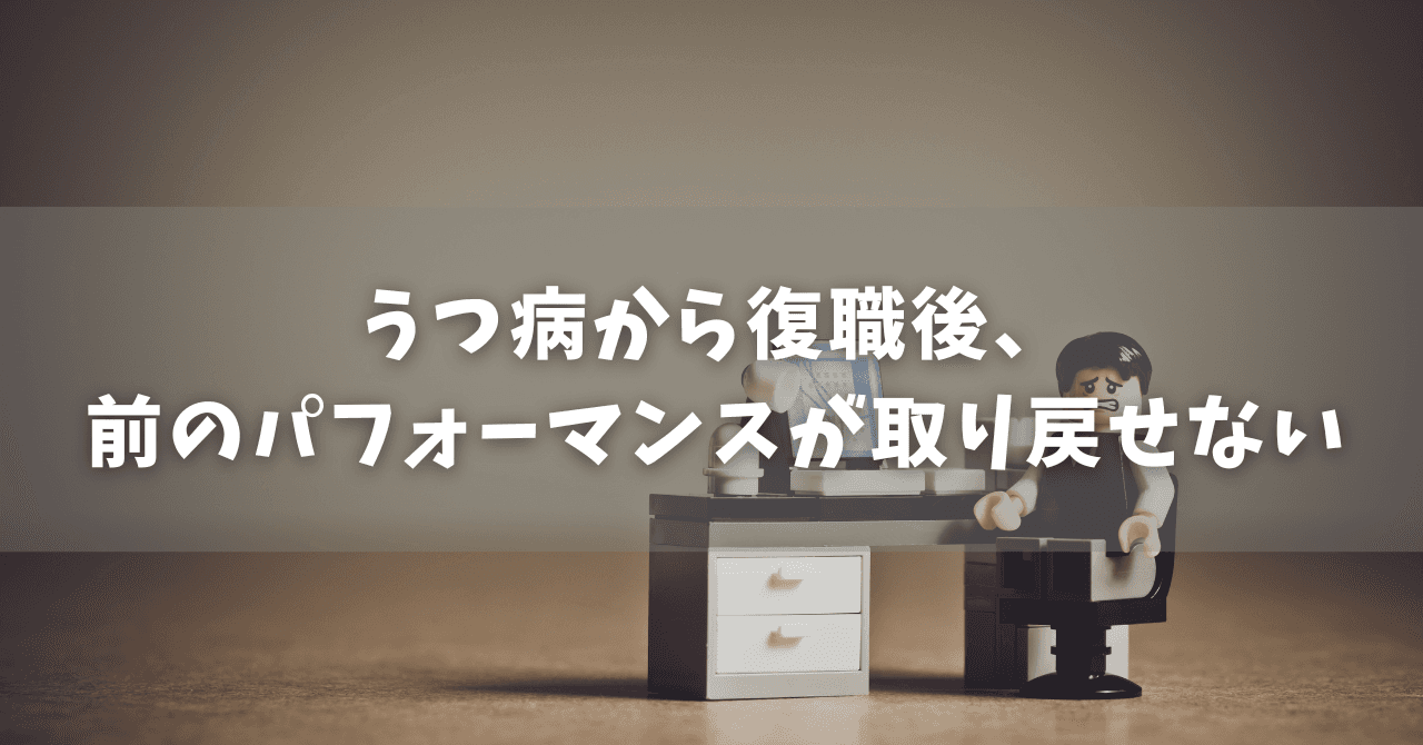 しかし、実際にうつ病にかかって休職・復職した患者さんの中には、順調に回復することが出来ない人もいます。そんな患者さんたちの大きな悩みの1つが、以前のパフォーマンスが取り戻せないこと。以前は出来ていたことが出来なくなった、という事に大きなストレスを抱えて症状を悪化させてしまいます。今回は、そのようなうつ病復職者の患者さんたちが、以前のパフォーマンスにとらわれることなく回復していくための考え方を探っていきます。